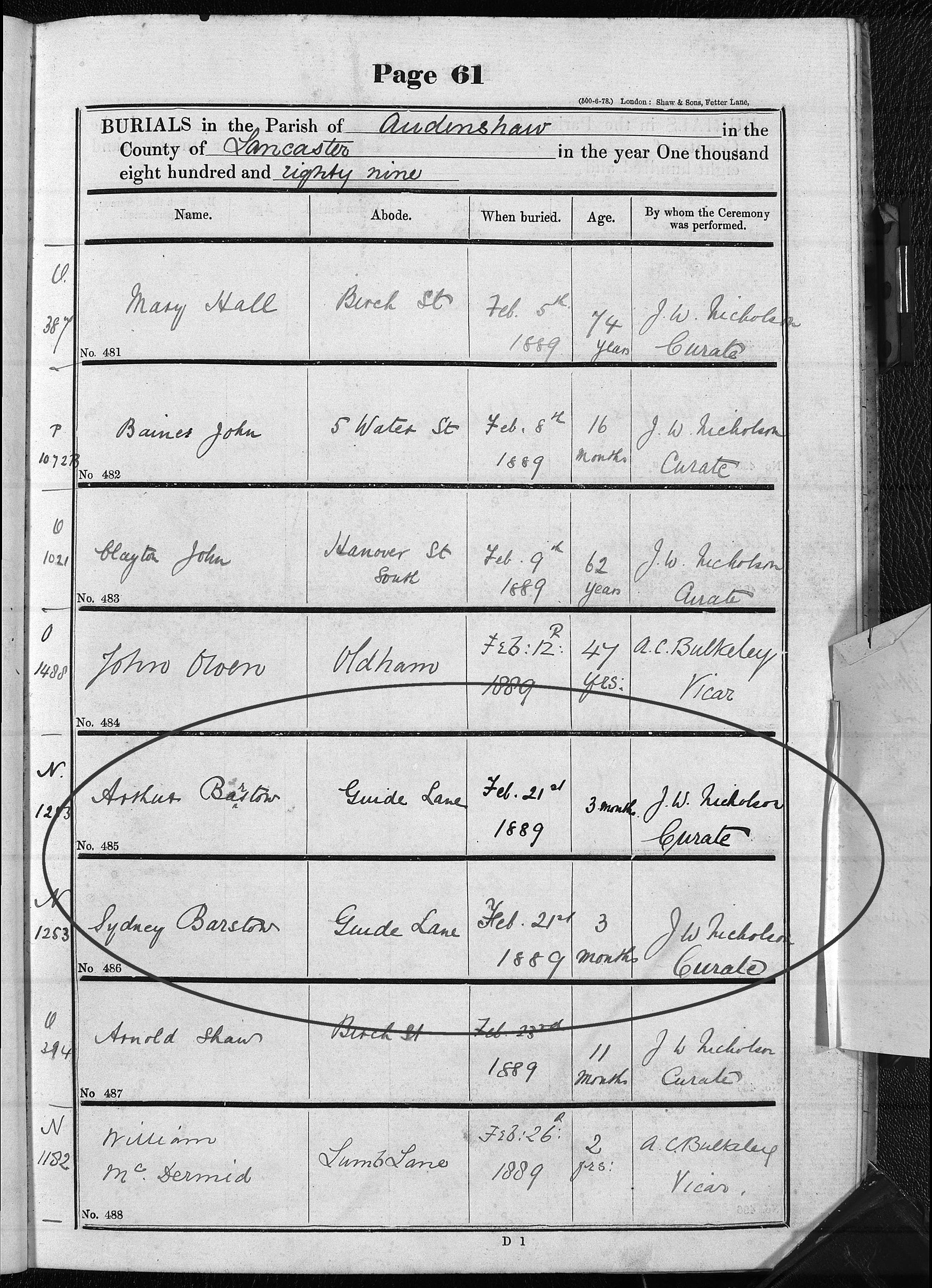 Local registry office death entries for Arthur and Sydney in 1889, AUD/33/32.