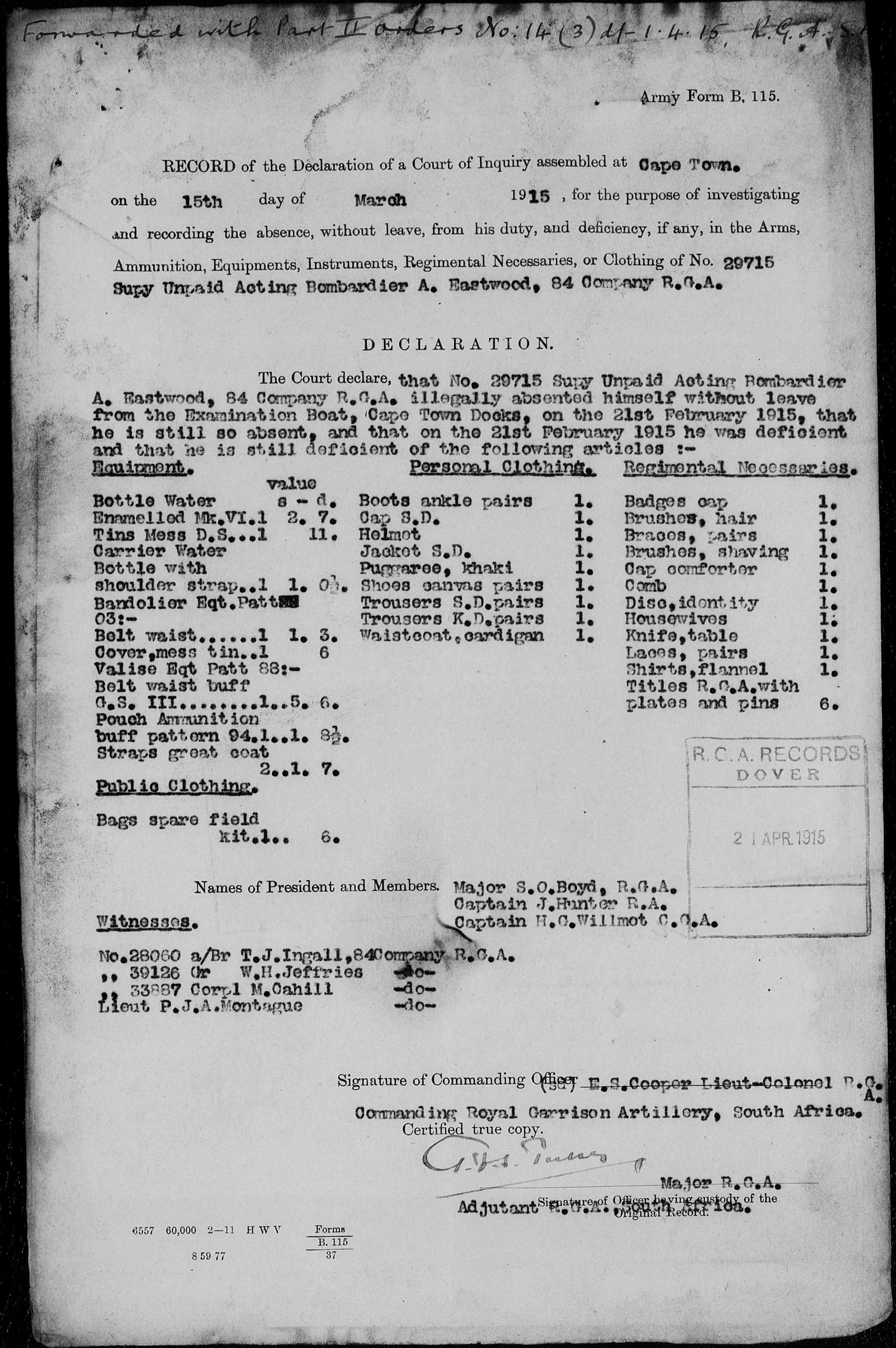 this is escalated by the court of inquiry (15th March 1915) declared on Army Form B. 115 acting Bombardier