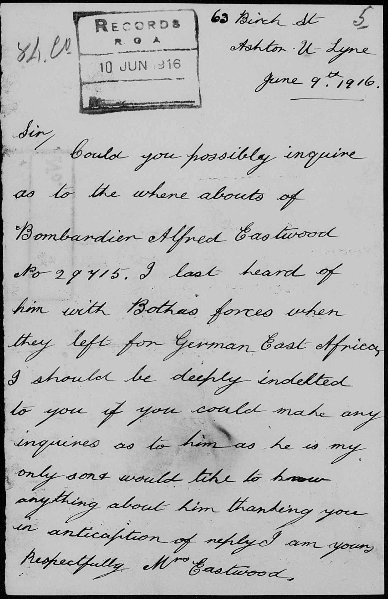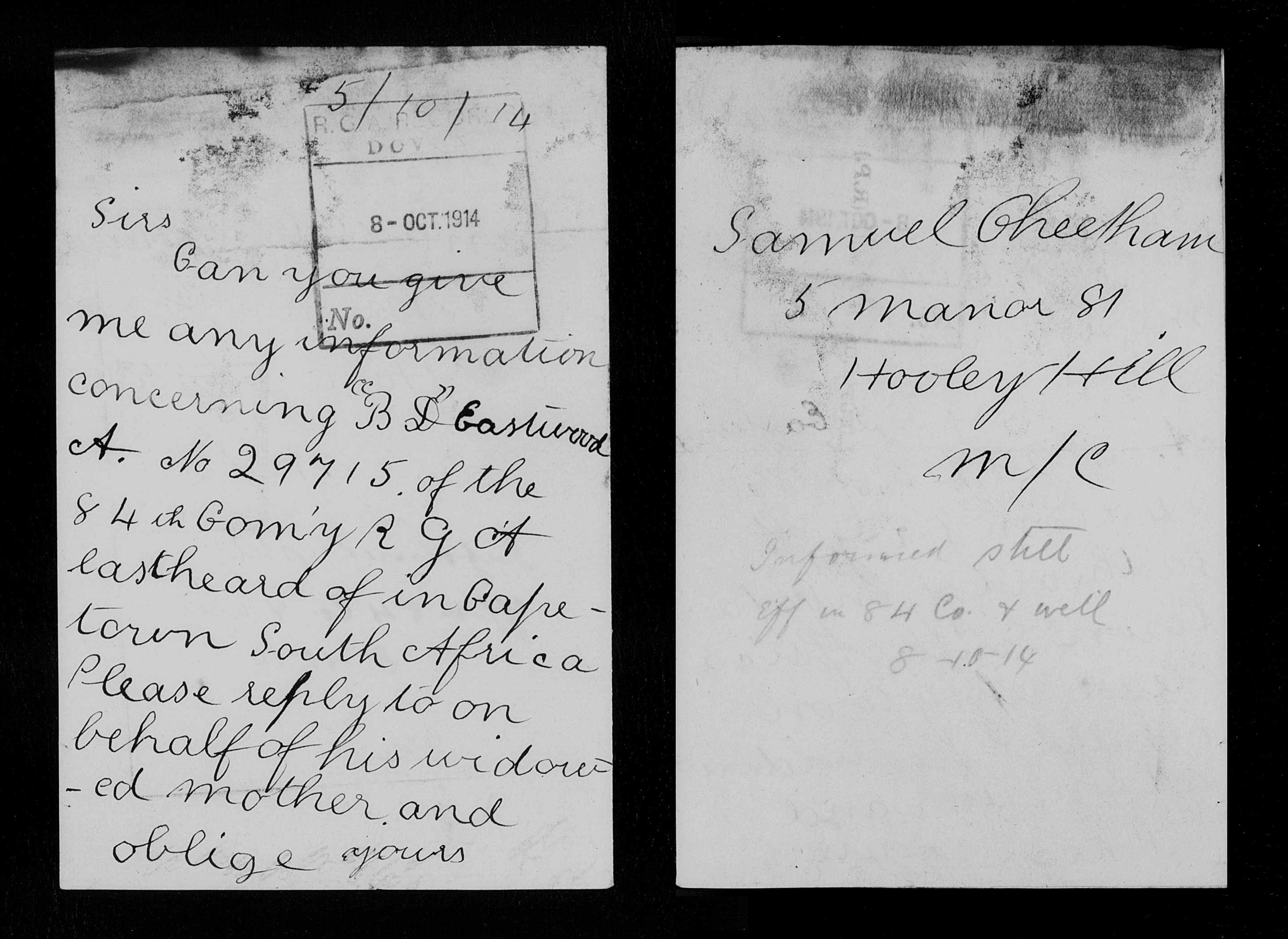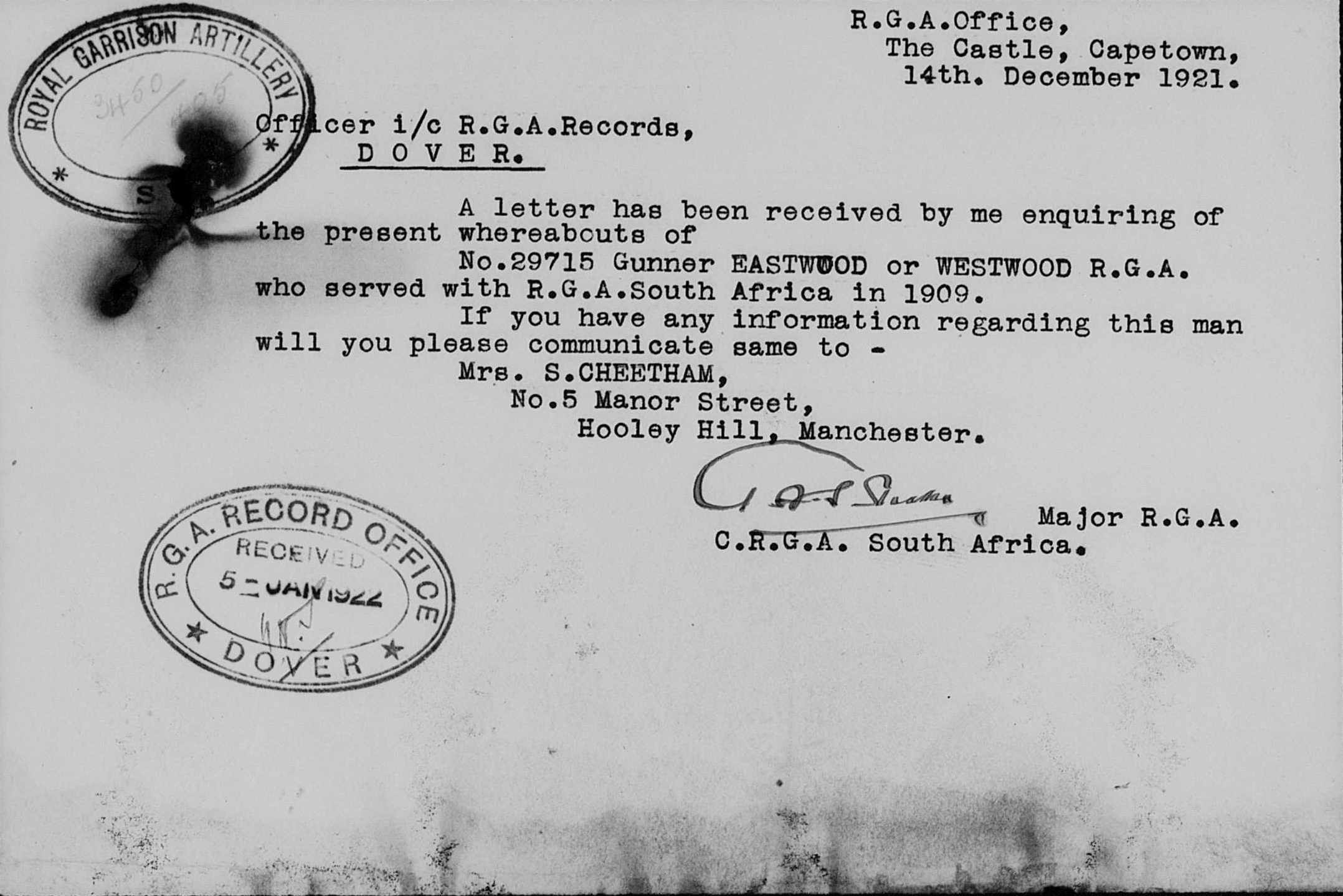 Cheethams wife) was still writing to the Army.